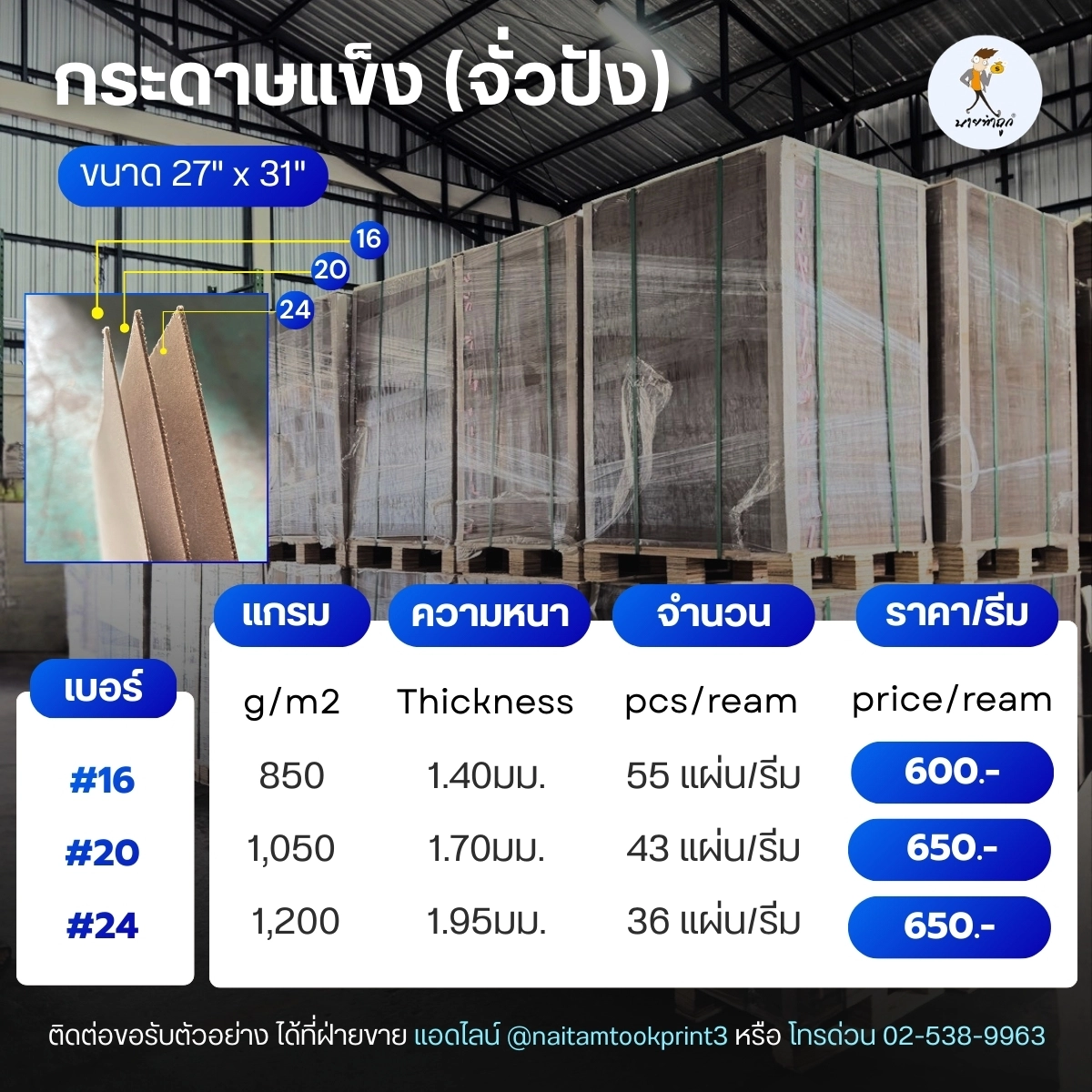 การเลือก กระดาษจั่วปัง ที่เหมาะกับงาน ไม่ใช่แค่เรื่องราคา แต่คือการเลือกให้ตรงกับการใช้งานจริง หากคุณกำลังมองหา กระดาษจั่วปัง ราคาถูก ที่ได้คุณภาพ สามารถติดต่อเพื่อขอคำแนะนำและใบเสนอราคา หรือขอรับตัวอย่างกับทีมขายได้ฟรีที่โทร 02-538-9963 หรือแชทด่วนผ่านไลน์ @naitamtookprint3